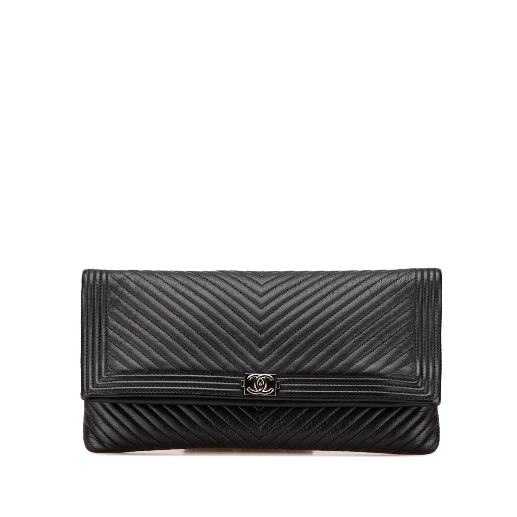 The Boy clutch features a quilted leather body, a fold over flap with top zip closure, and an exterior zip pocket.