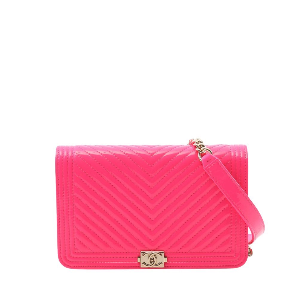 The Boy wallet on chain features a quilted patent leather body, a chain strap with leather shoulder guard, a front flap with push lock closure, an interior zip compartment, and interior slip pockets.
