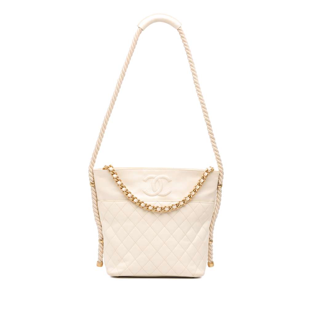 This satchel features a crumpled and quilted calf leather body, leather woven chain handle, rope shoulder strap, a top zip closure, and an interior zip pocket.