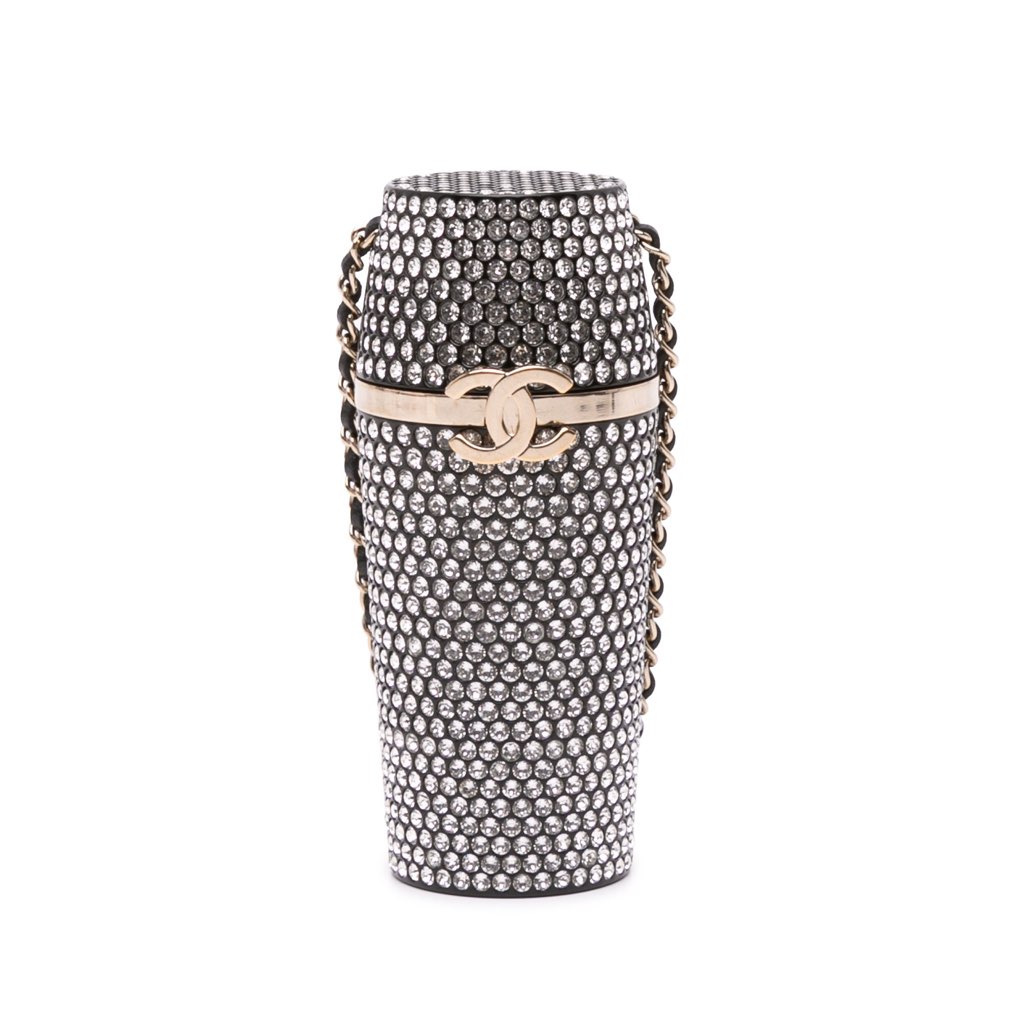 This Lipstick Case on Chain features a resin body with crystal embellishments, a leather woven chain link strap, and a top flap with a push lock closure.