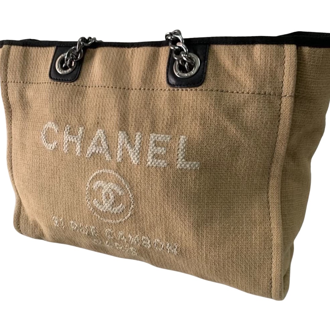 Chanel Deauville Tote Bag in beige canvas with leather handles/straps: Description•Material: beige canvas body, with leather handles + chainleather shoulder straps. •Style: opentop tote — roomy, casualchic, good for everyday use, errands, or travel. Typical size (for a medium / common version)•Width: ~39cm •Height: ~30cm •Depth: ~22cm