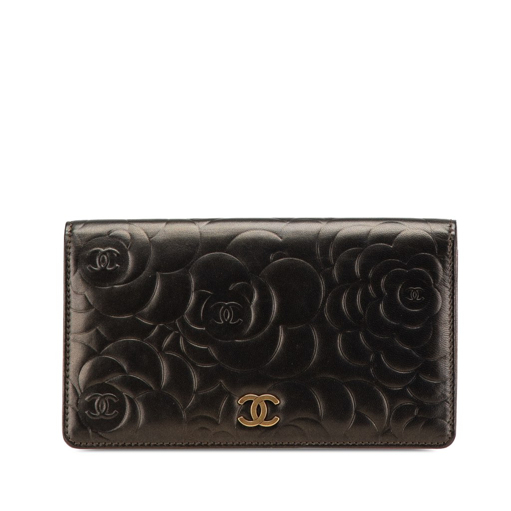 The Camellia wallet features an embossed leather body and interior zip and slip pockets.