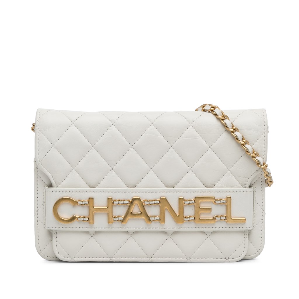 This crossbody bag features a quilted lambskin leather body, a curb chain strap, a front flap with magnetic closure, and an interior zip pocket.