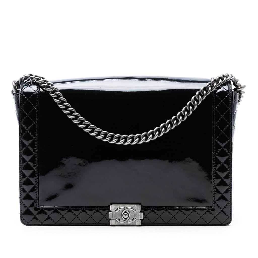 This Boy Reverso features a patent leather body, a silver-tone curb chain link with adjustable flat leather strap, a front flap with push-lock closure, and interior zip and slip pockets.
