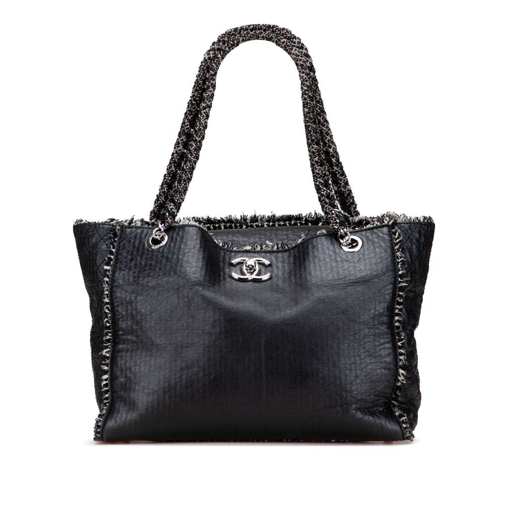 This tote features a leather body with tweed trim, tweed-woven chain straps, a fold in top flap with CC turn lock closure, and an interior zip pocket.