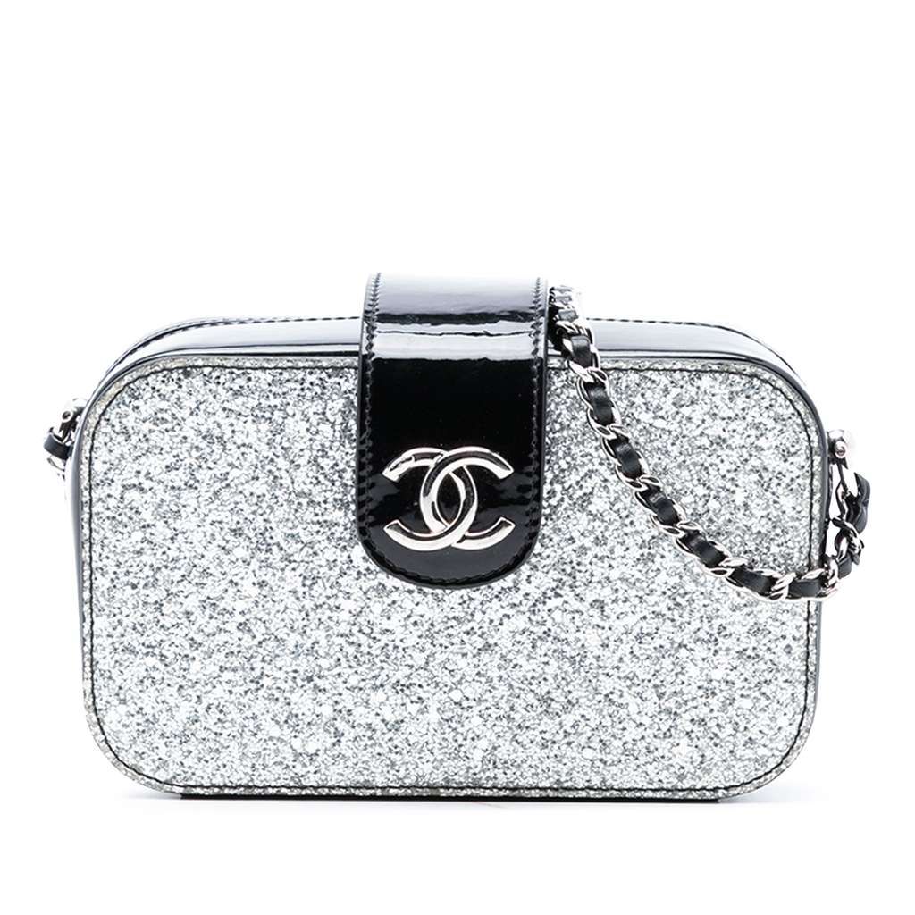 This crossbody features a glittered patent leather body, a leather-woven chain strap with leather shoulder guard, and a top strap with magnetic snap closure.