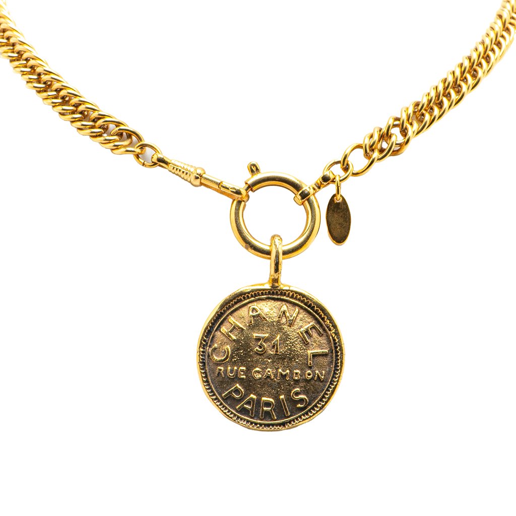 This necklace features a gold-tone pendant, a gold-tone chain, and a spring ring closure.