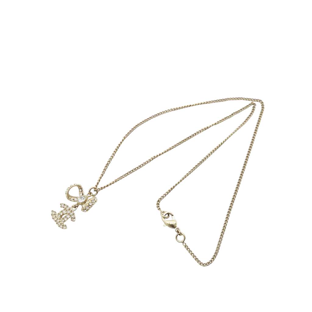 This necklace features a gold plated chain and pendant with crystal details, and a lobster claw closure.