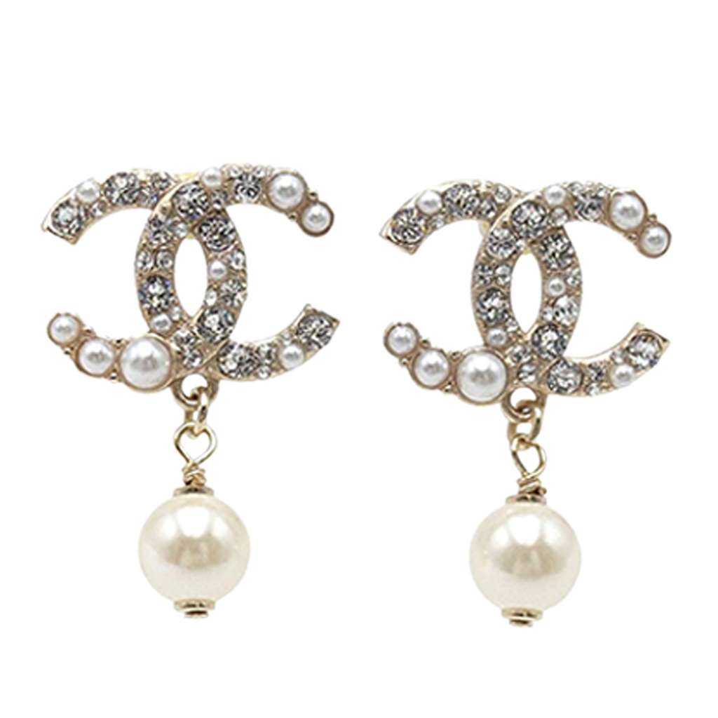 These earrings feature a gold-tone metal body with faux pearl and crystal embellishments, faux pearl charms, and a bullet back closure.