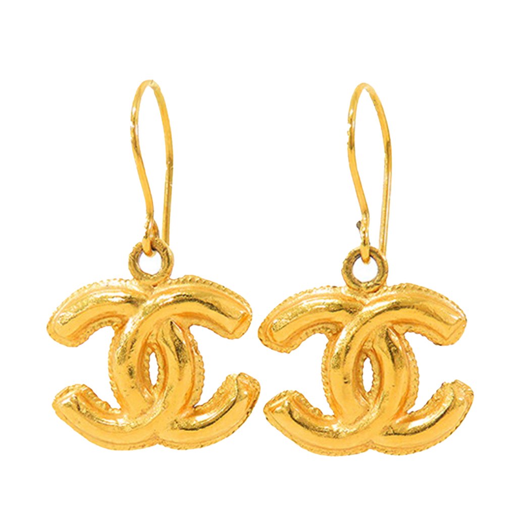 These earrings feature a dangling CC gold plated metal hardware and a hook closure.