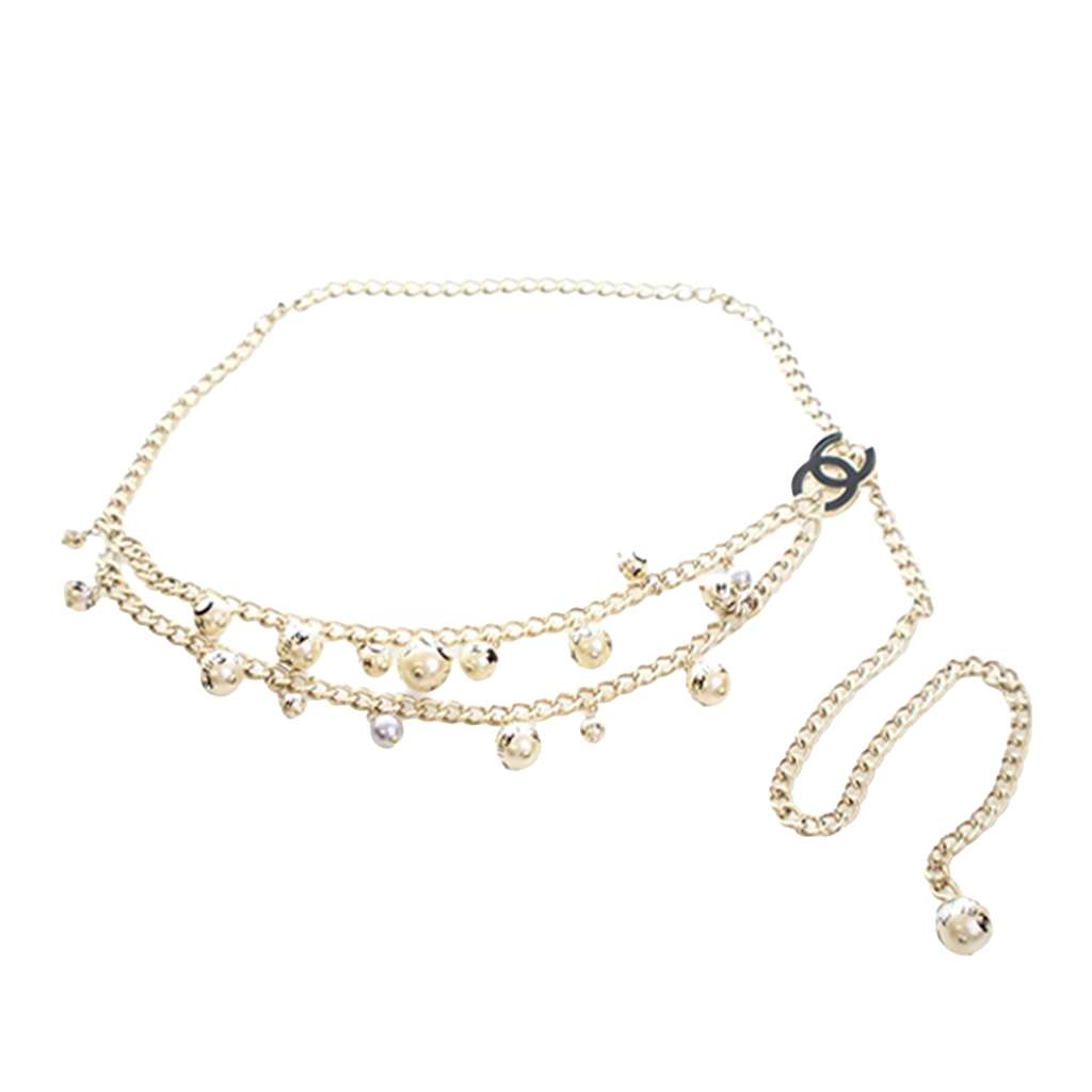 This belt features a gold-plated body with faux pearls embellishments, a CC logo, and a hook closure.