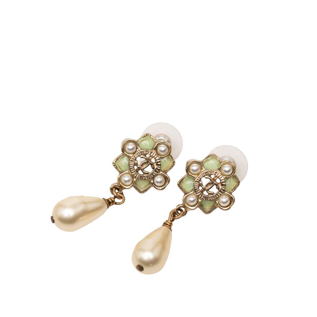 These earrings feature a gold-plated metal body with CC faux pearl and resin embellishments and bullet back closures.