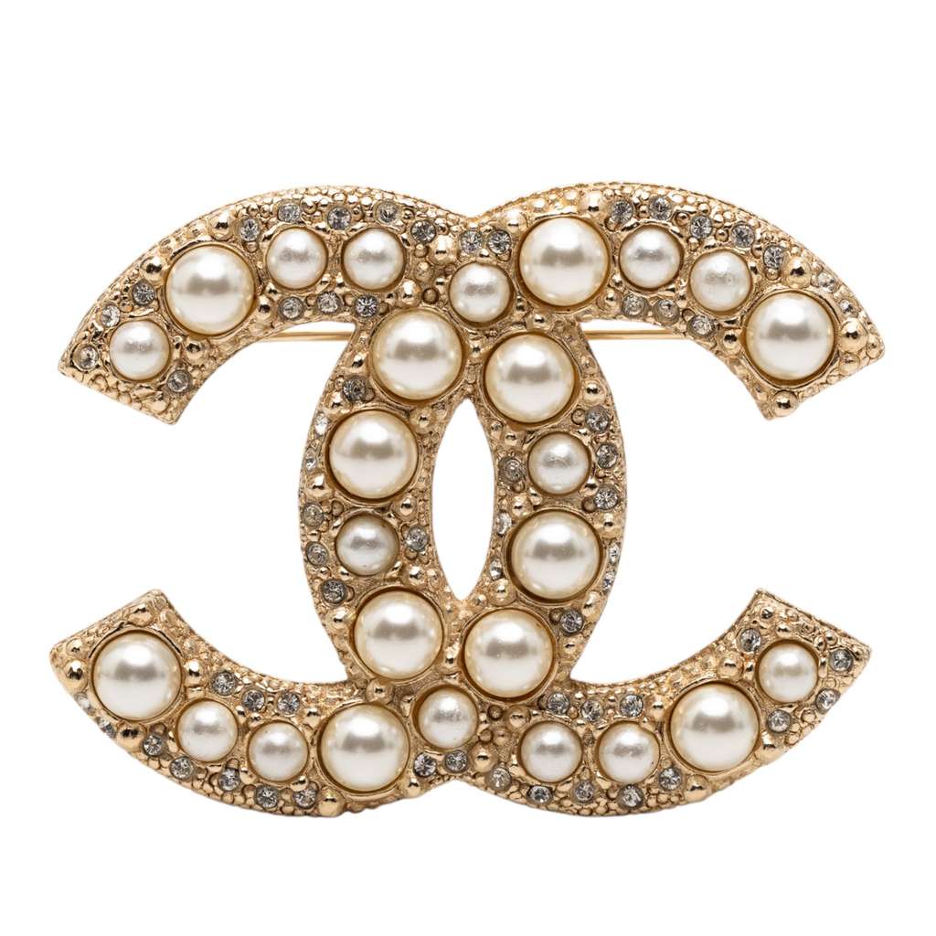 This brooch features a gold-tone metal body, faux pearls and rhinestone embellishments, and a back pin closure.