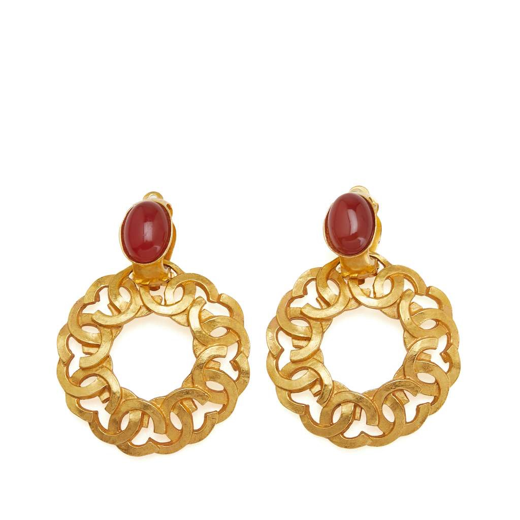 These earrings feature a gold-plated body with glass detail and a clip-on closure.