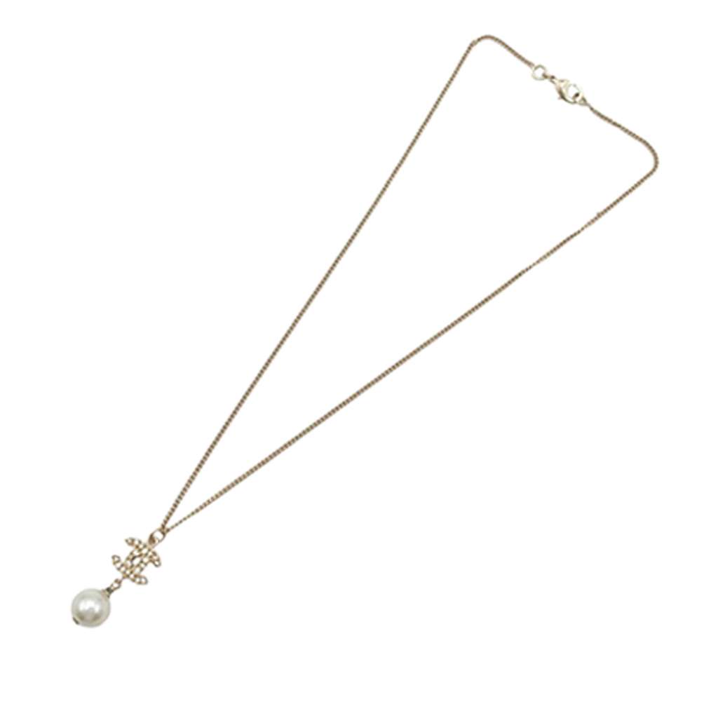 This necklace features a gold-tone metal body, gold-tone pendant with faux pearl and rhinestone embellishments, and a lobster claw clasp closure. Motif size: 2.80 cm x 1.20 cm