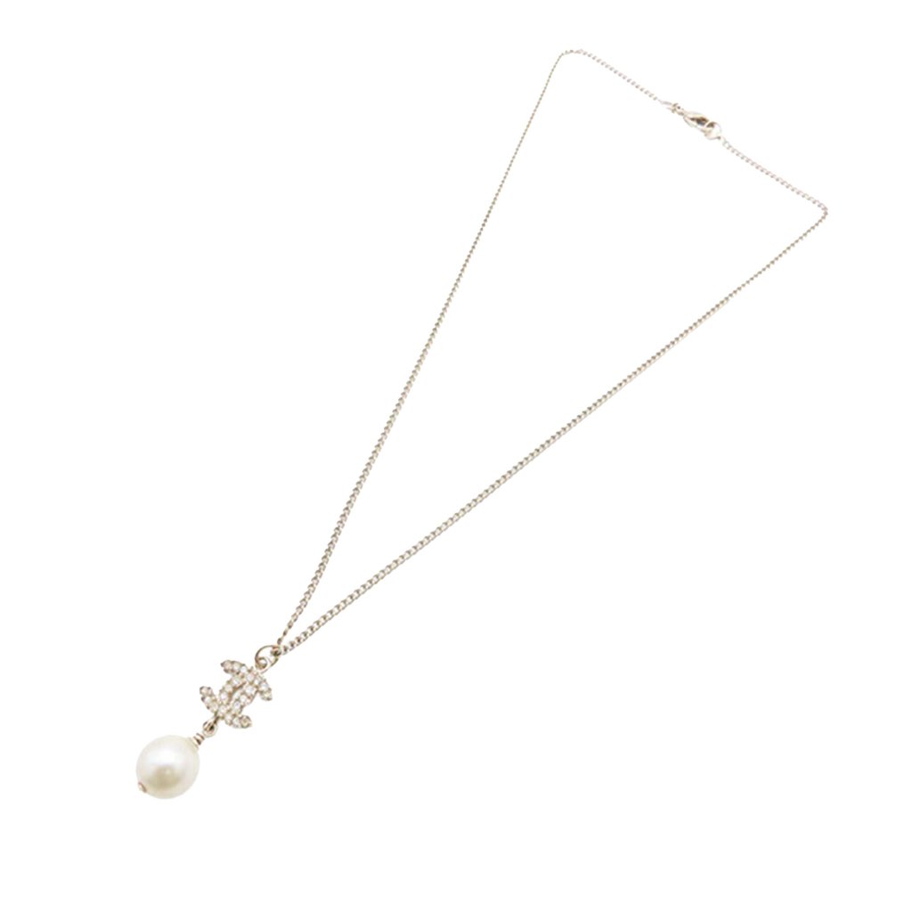 This necklace features a gold-plated body with rhinestones, faux pearl pendant, and a lobster clasp closure.
