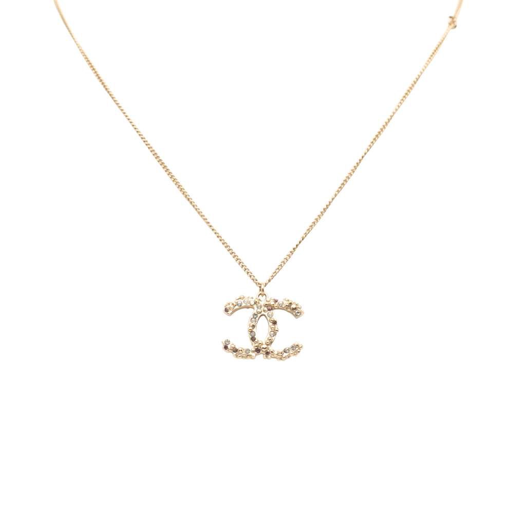 This necklace features a gold-tone pendant with rhinestones embellishments, a gold-tone chain, and lobster clasp closure.