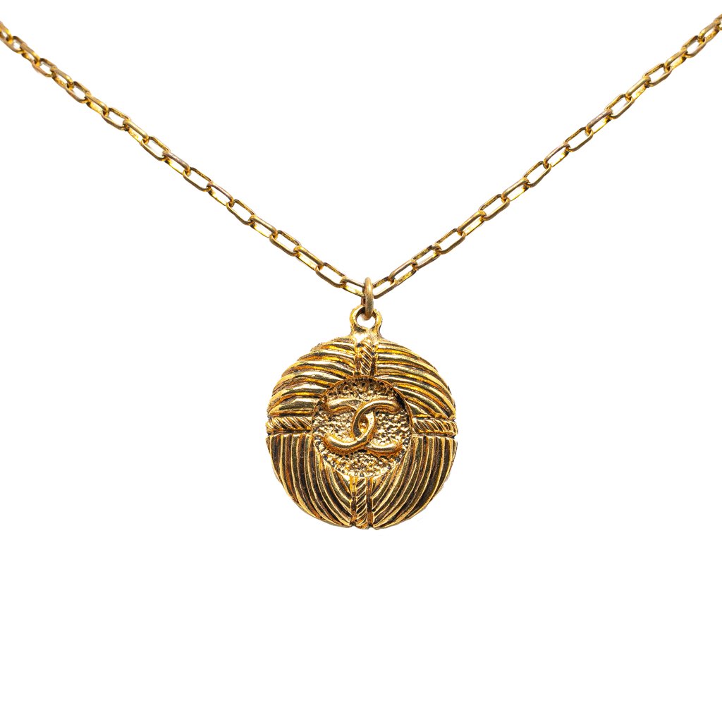 This necklace features a CC pendant, a gold-tone chain, and a spring ring closure.