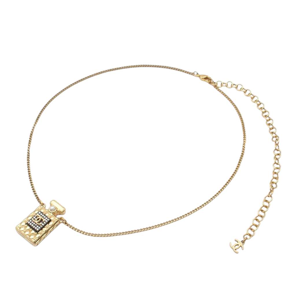 This necklace features a gold-plated metal chain, a perfume bottle pendant with crystal and faux pearl details, and a lobster clasp closure. Motif size: 2.7 cm x 1.8 cm.