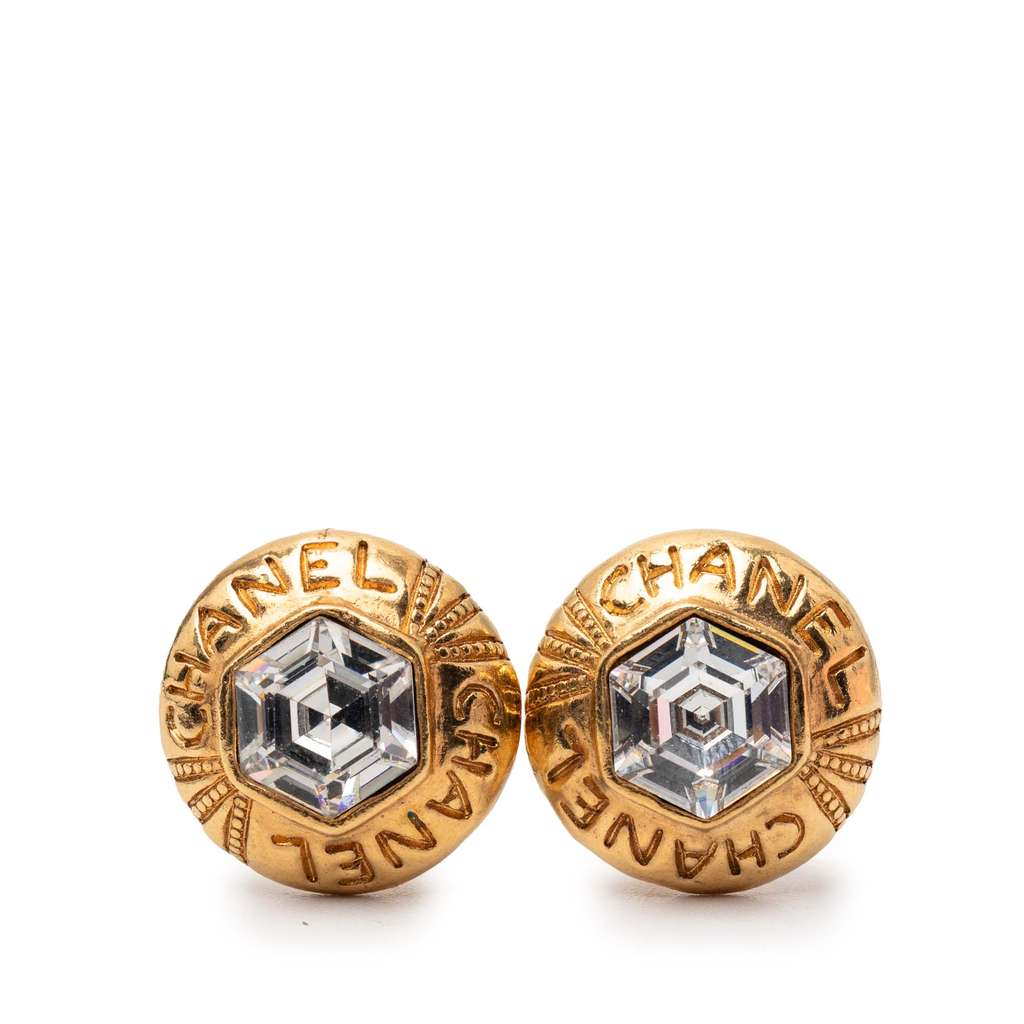 Chanel Gold Plated Crystal Logo Hexagonal Clip On Earrings G