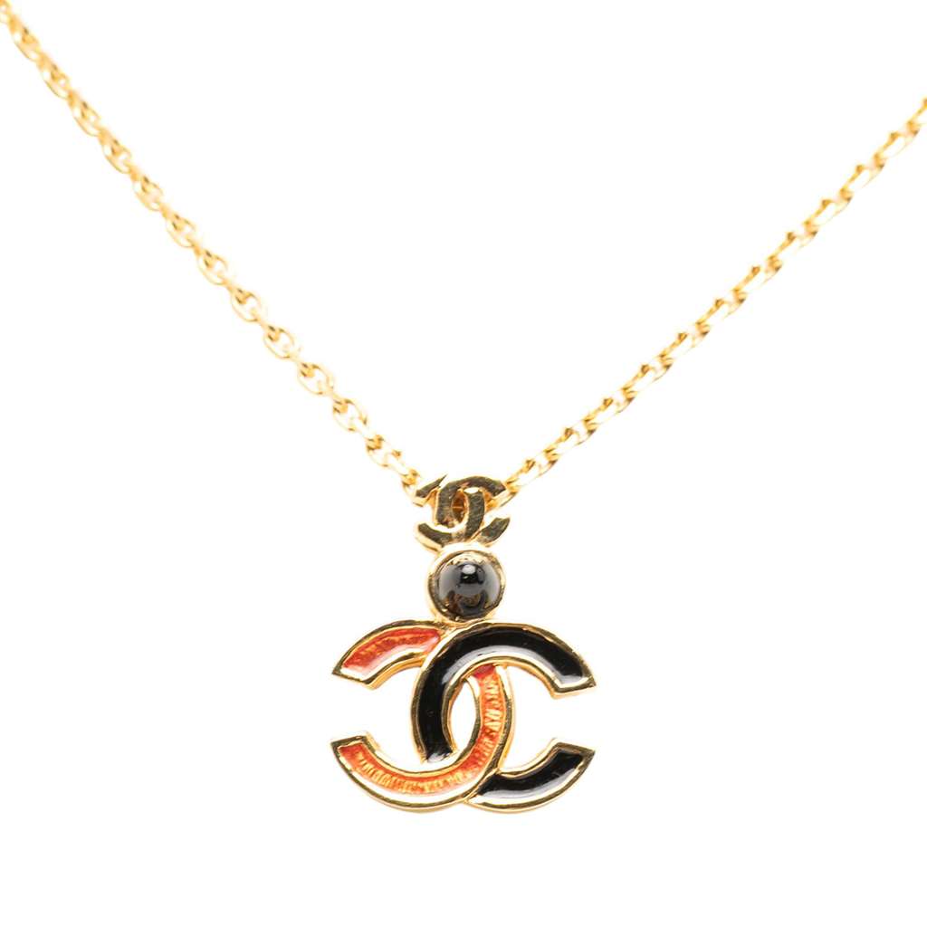 This necklace features a gold tone metal body, an enamel pendant, and a spring ring closure.
