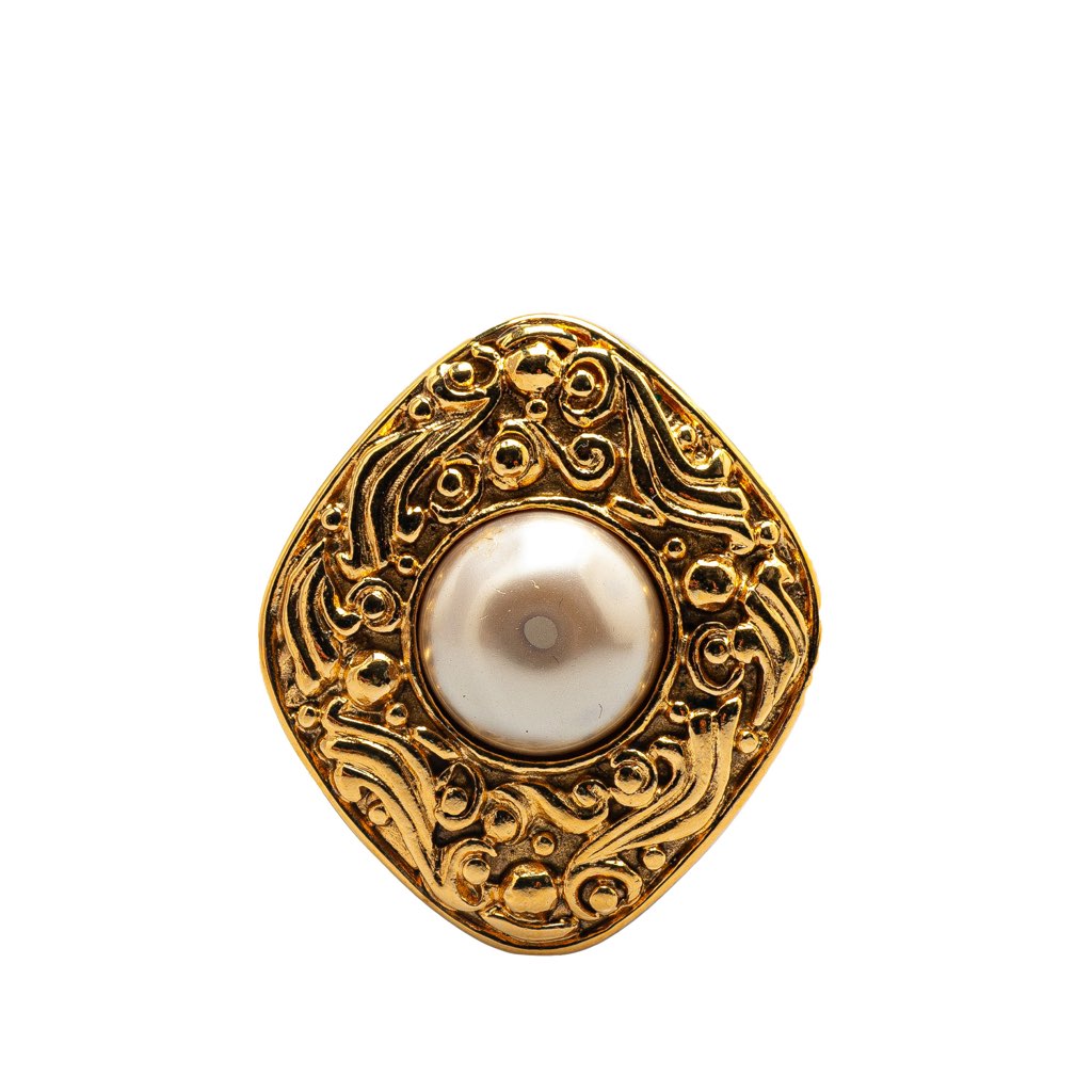 This brooch features a gold-tone metal body, faux pearl, and a back pin closure.
