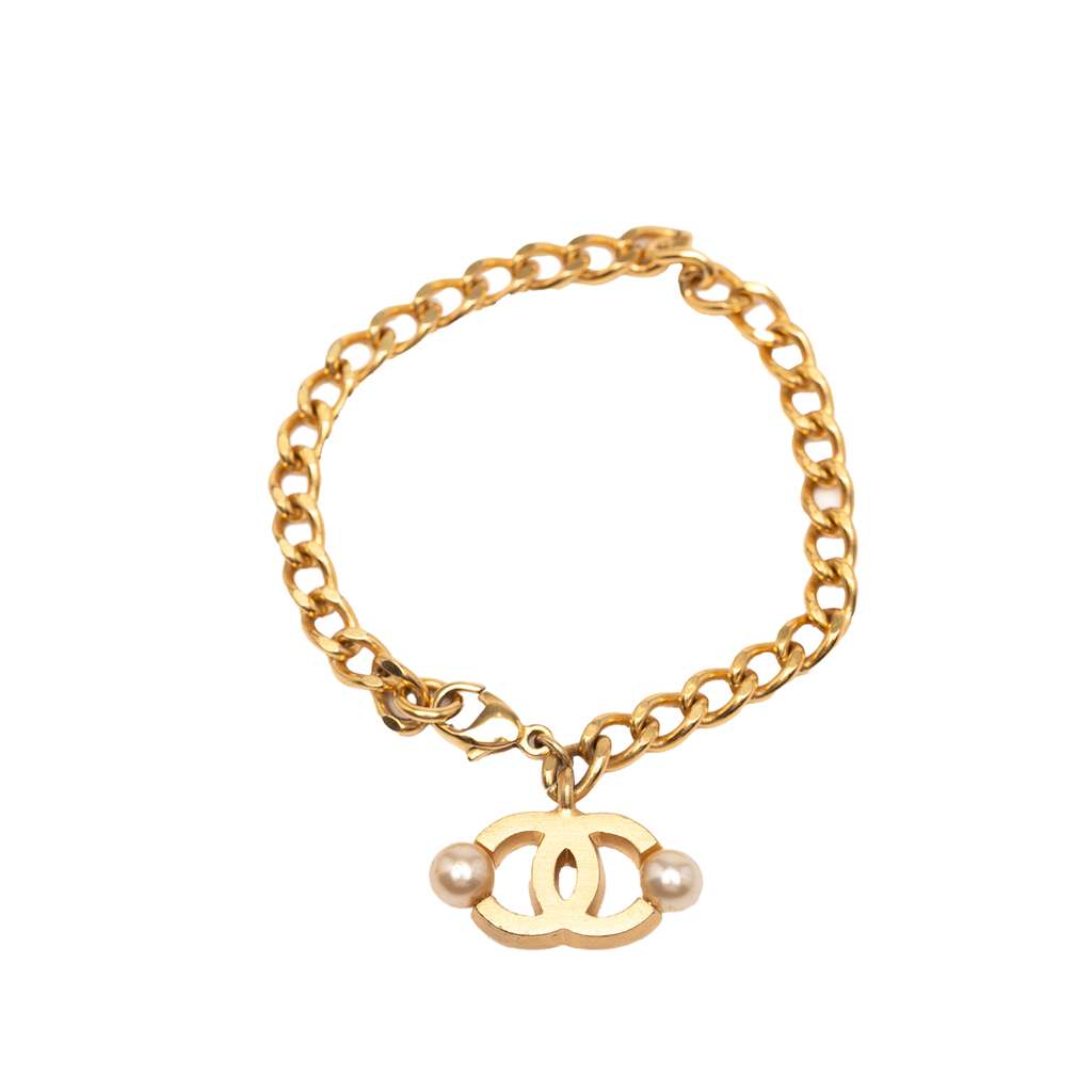 This bracelet features a gold-tone metal body with CC faux pearl details, and a claw clasp closure.