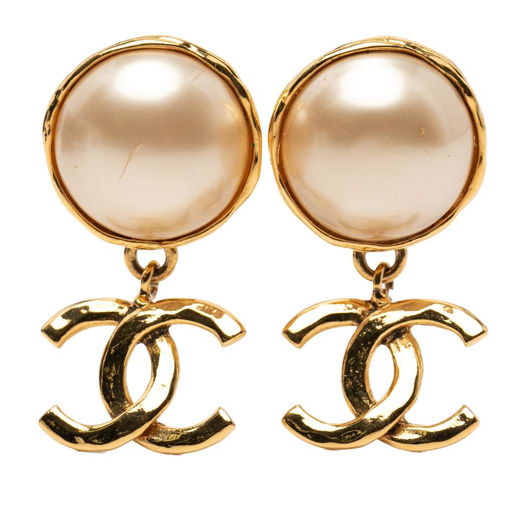 These earrings feature a gold-tone metal and faux pearl body, and clip on closures.