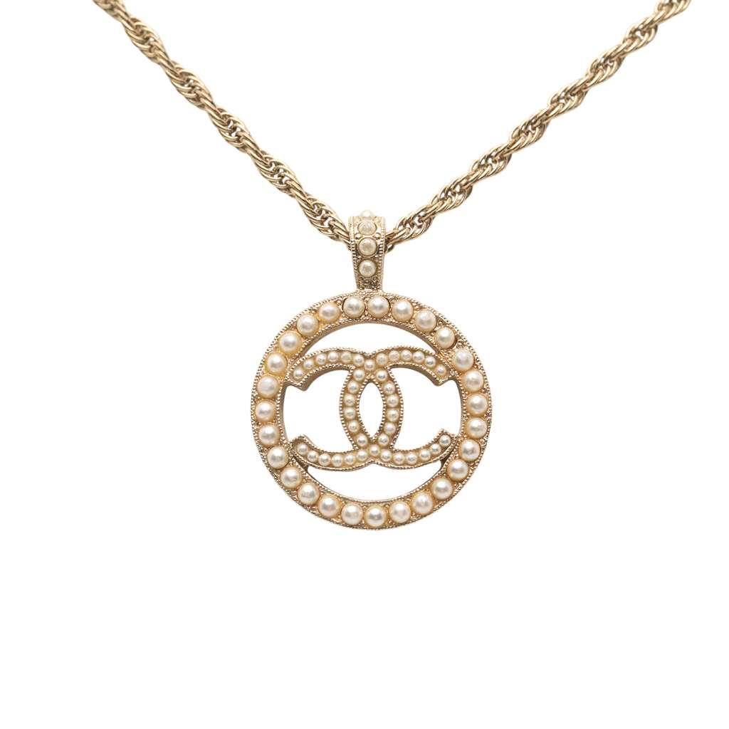 This necklace features a gold-plated metal body, gold-tone chain with CC round faux pearl pendant and lobster clasp closure.
