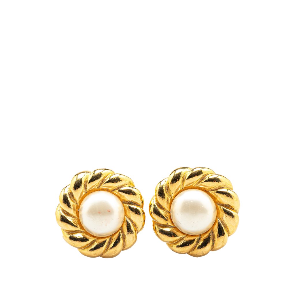 These earrings feature a gold-plated metal body, faux pearl, and clip-on closures.