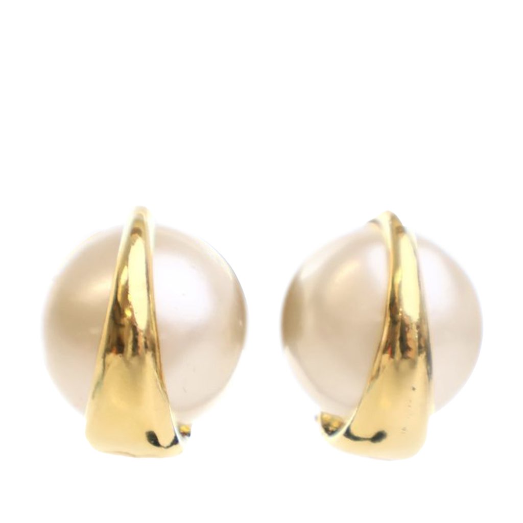 These earrings features a gold plated metal body with faux pearl, and back clip on closures.