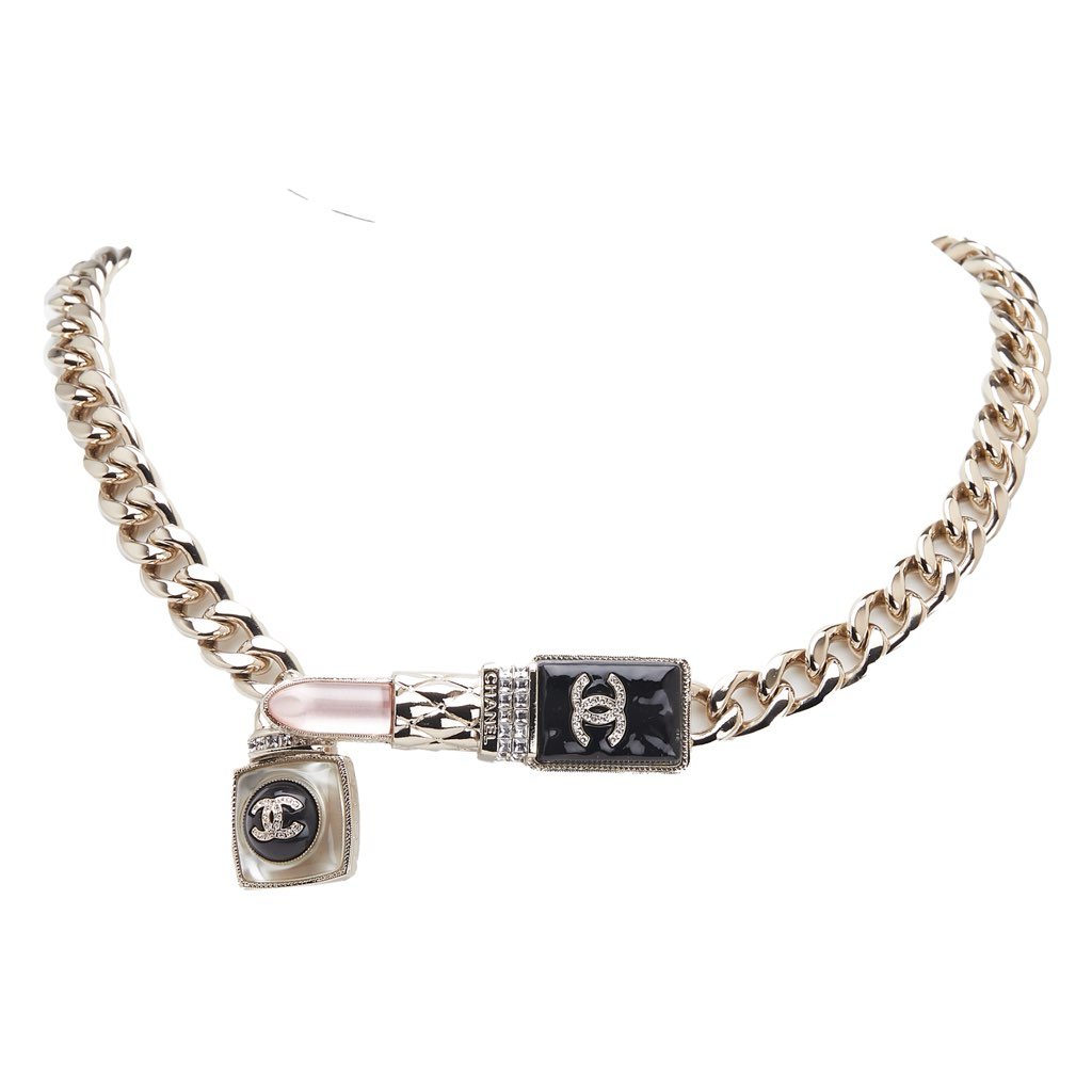 This necklace features a gold-plated chain link necklace, a faux pearl perfume bottle with rhinestones details, a glass lipstick charm with rhinestones embellishments and a hook closure.