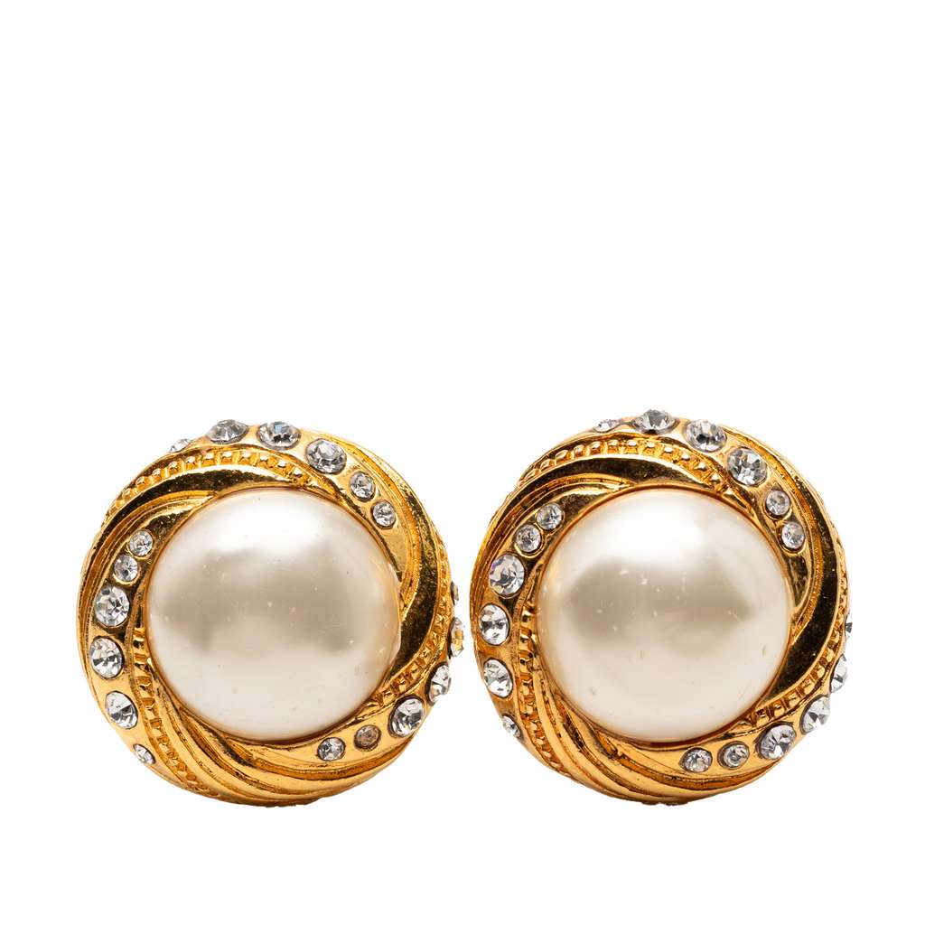 These earrings features a gold plated metal body, faux pearl, rhinestones details, and clip on closures.