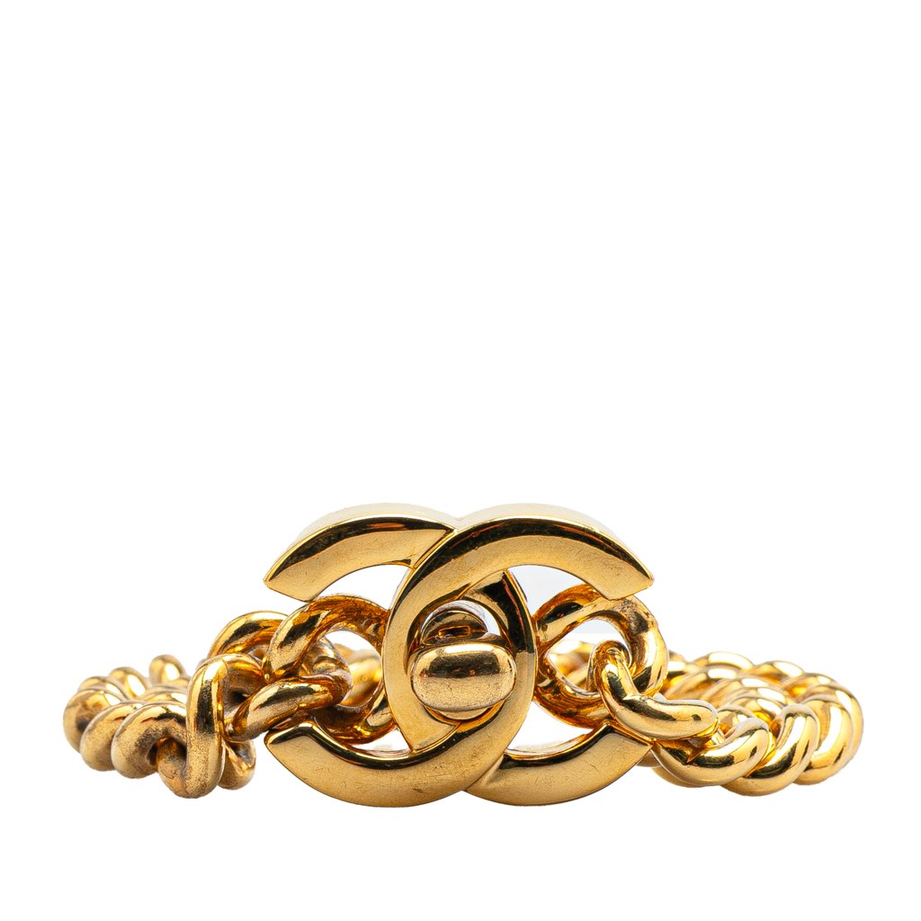This bracelet features a gold-plated metal body and a turn-lock closure.