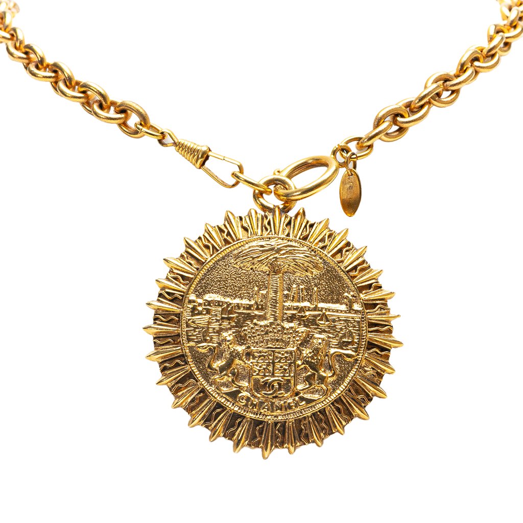 This necklace features a gold tone chain and pendant, and a spring ring closure.