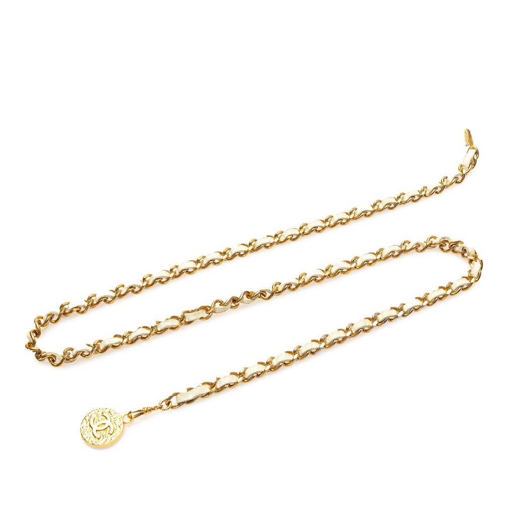 This belt features a leather woven gold-tone chain link, a medallion charm, and a hook closure.