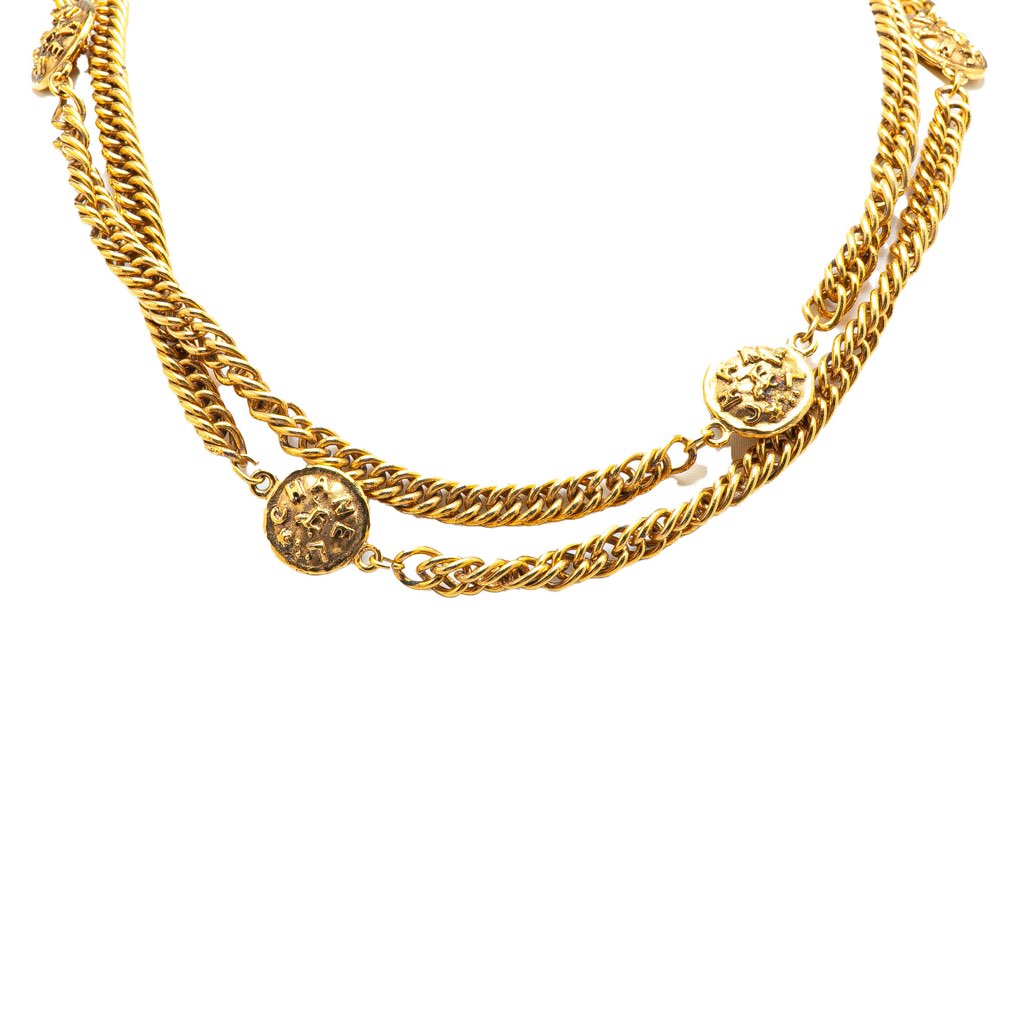 This necklace features a gold tone chain and medallion charms.