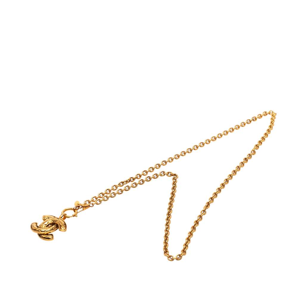 This necklace features a gold-plated metal chain and pendant and a spring ring closure.
