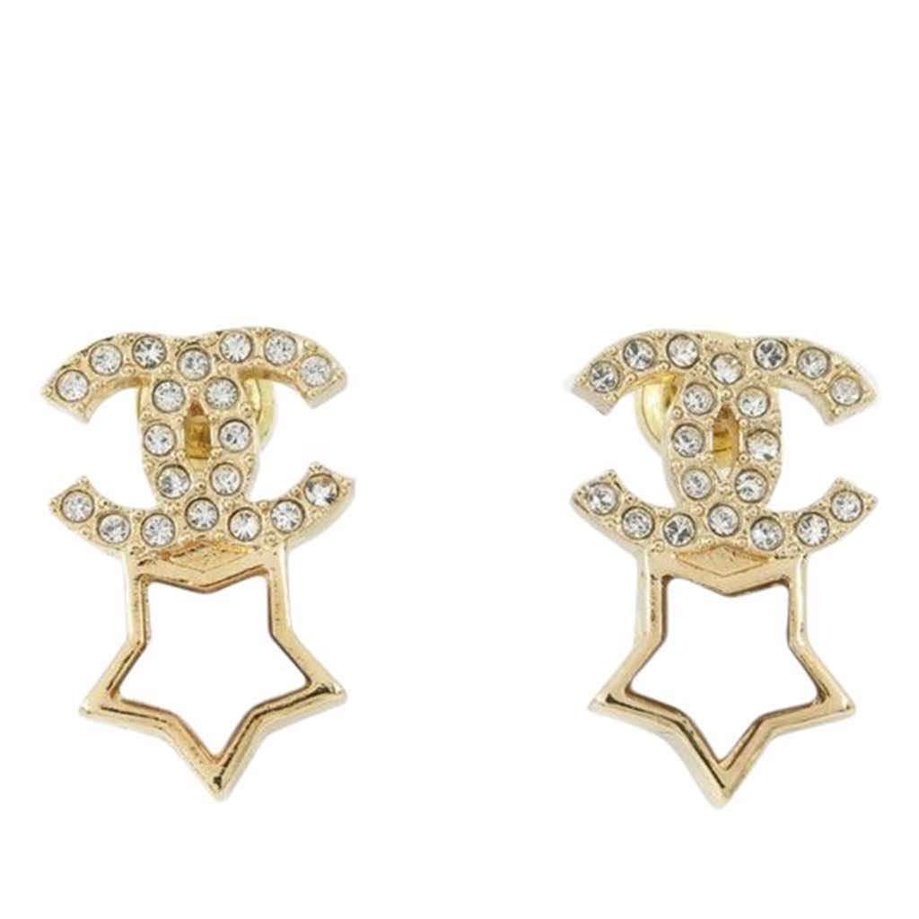 These earrings feature a gold-plated body, CC logo with rhinestones details, a faux pearl star and push back closure.