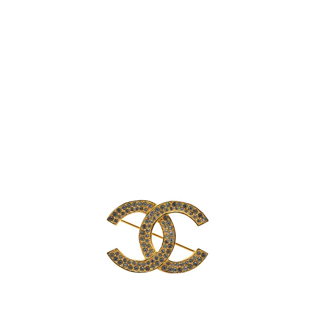 This brooch features a gold plated body with rhinestone details, and a back pin closure.