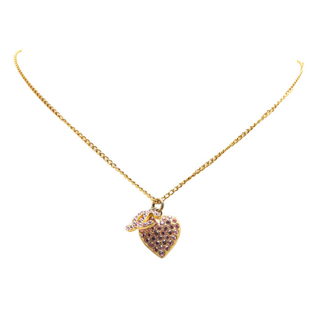This necklace features a gold plated chain, CC and heart pendants with rhinestone details, and a lobster clasp closure.
