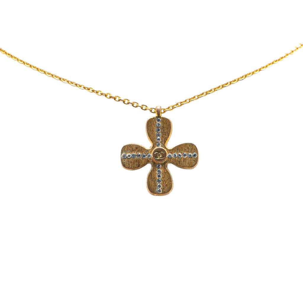 This necklace features a gold-tone pendant with rhinestone details, a gold-tone chain, and a spring ring closure.