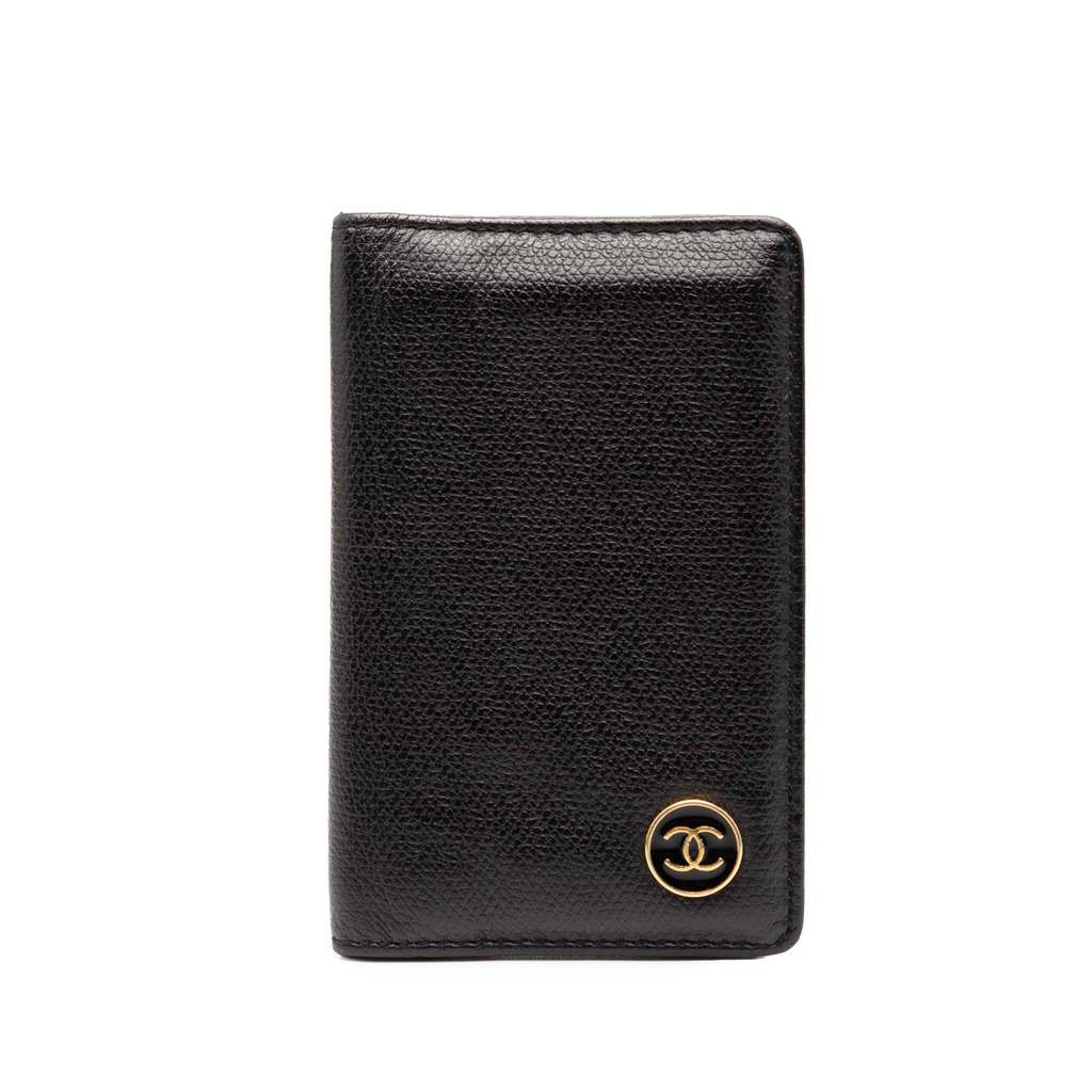 This card holder features a leather body and interior slip pockets.