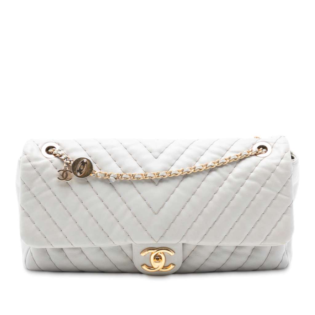 This shoulder bag features a quilted leather body, a gold-tone chain strap with leather guard a front flap with interlocking Cs and twist lock closure, and an interior zip pocket.