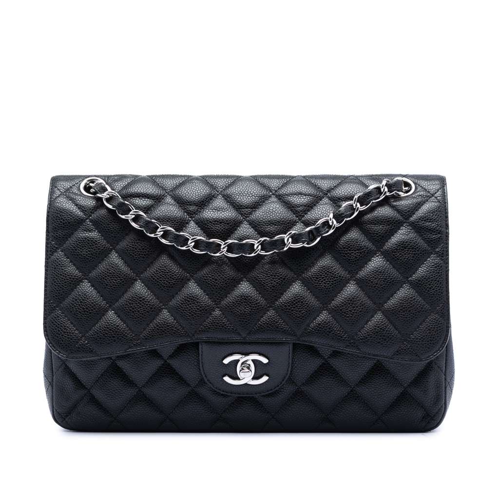 This shoulder bag features a quilted caviar leather body, leather woven chain straps, a double top flap with CC turn-lock closure, an exterior back slip pocket, and interior zip and slip pockets.