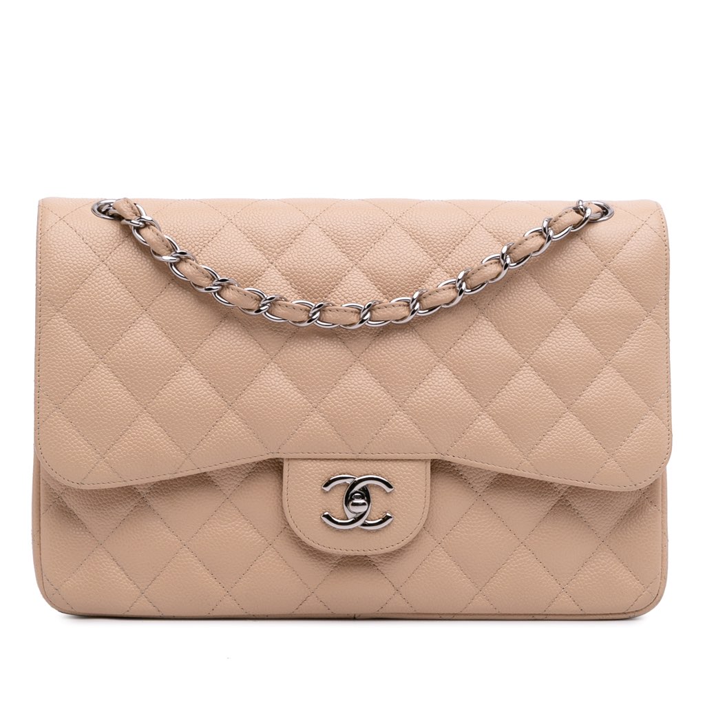 The Jumbo Classic features a quilted caviar leather body, exterior front and back slip pockets, leather woven chain straps, a double top flap with CC turn lock closure, and interior zip and slip pockets.