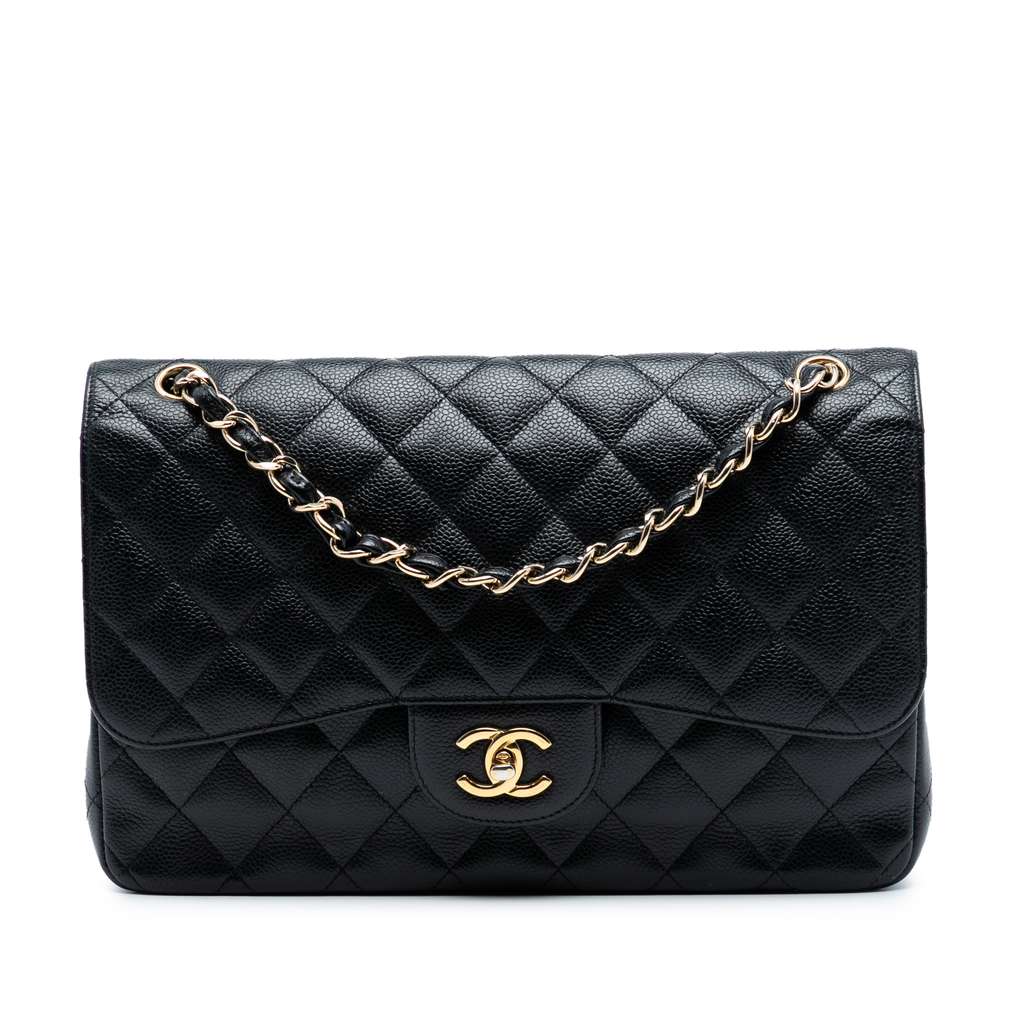 This shoulder bag features a quilted caviar leather body, leather woven chain straps, a double top flap with CC turn-lock closure, an exterior back slip pocket, and interior zip and slip pockets.