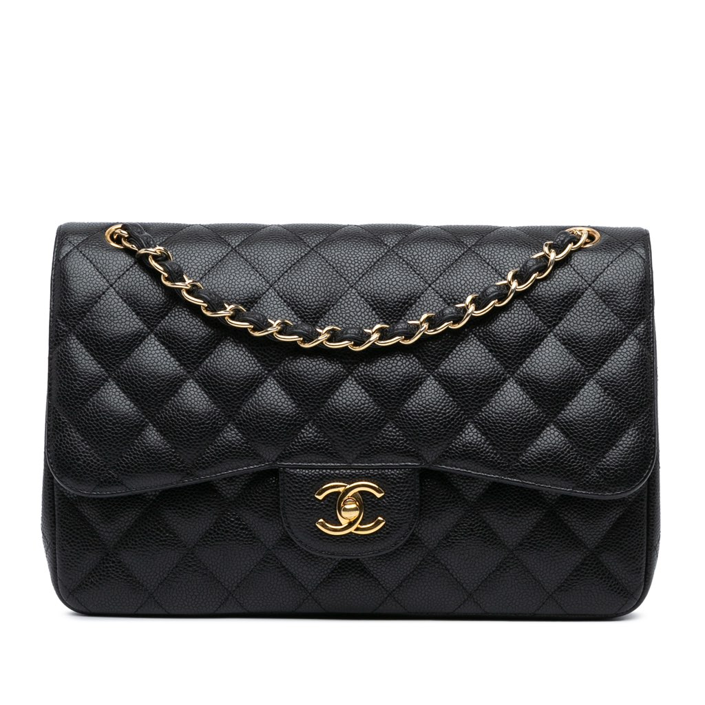 This shoulder bag features a quilted caviar leather body, leather woven chain straps, a double top flap with CC turn-lock closure, an exterior back slip pocket, and interior zip and slip pockets.