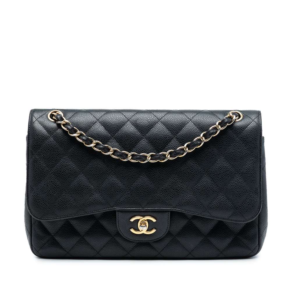 This shoulder bag features a quilted caviar leather body, leather woven chain straps, a double top flap with CC turn-lock closure, an exterior back slip pocket, and interior zip and slip pockets.