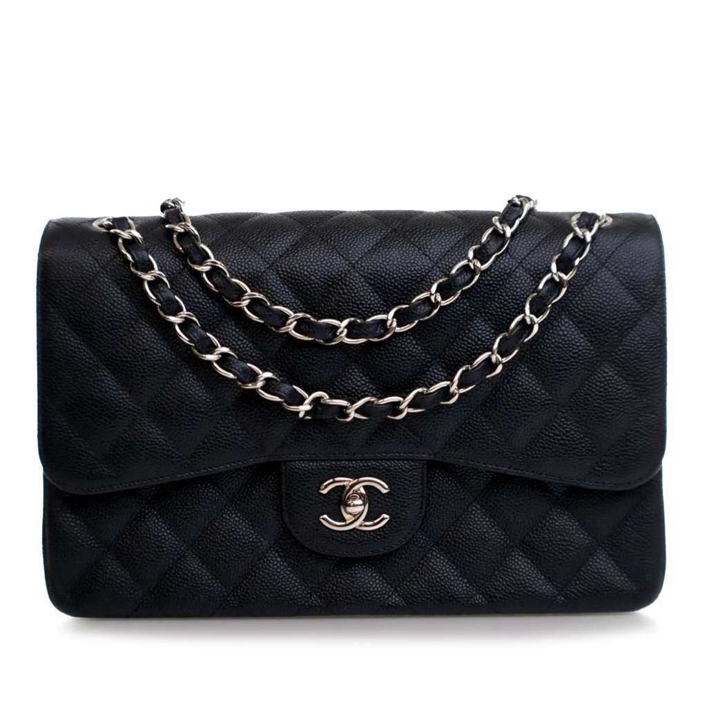 This shoulder bag features a quilted caviar leather body, leather woven chain straps, a double top flap with CC turn-lock closure, an exterior back slip pocket, and interior zip and slip pockets.
